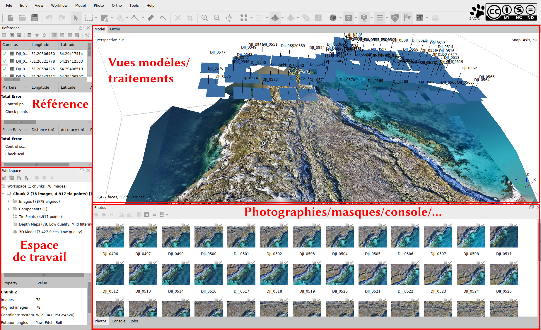 L'interface principale est composée des panneaux "Workspace"et "Reference". Dans la capture d'écran, je les ai mis l'un au-dessus de l'autre, mais par défaut, ce sont deux panneaux que l'on choisit d'afficher alternativement. Le premier permet de gérer les "chunks" (les regroupements d'images) et ce qu; ils contiennent (les nuages de points, modèles, textures, orthophotographies, MNT, ...) et le deuxième, tout ce qui peut servir à référencer spatialement notre modèle, coordonnées géographiques, points de référence ou échelles. La zone principale permet d'afficher une vue 3D avec la position des clichés et les différents modèles générés, mais aussi d'observer les traitements issus des modèles comme les orthophotographies, MNT,... En bas, on peut observer les clichés dans leur ensemble, mais aussi les cartes de profondeurs réalisées à partir de ces clichés ou les masques qui les accompagnent, par exemple.
