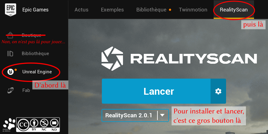 ) et c'est sur le panneau de côté qu'il faut cliquer sur "Unreal Engine" (1) et, sur la nouvelle page, cliquer sur RealityScan (2) et le gros bouton du milieu (jaune ou bleu) vous permet d'installer, mettre à jour ou lancer le logiciel. L'installation est un peu particulière, mais elle permet un maintien des versions assez pratique.