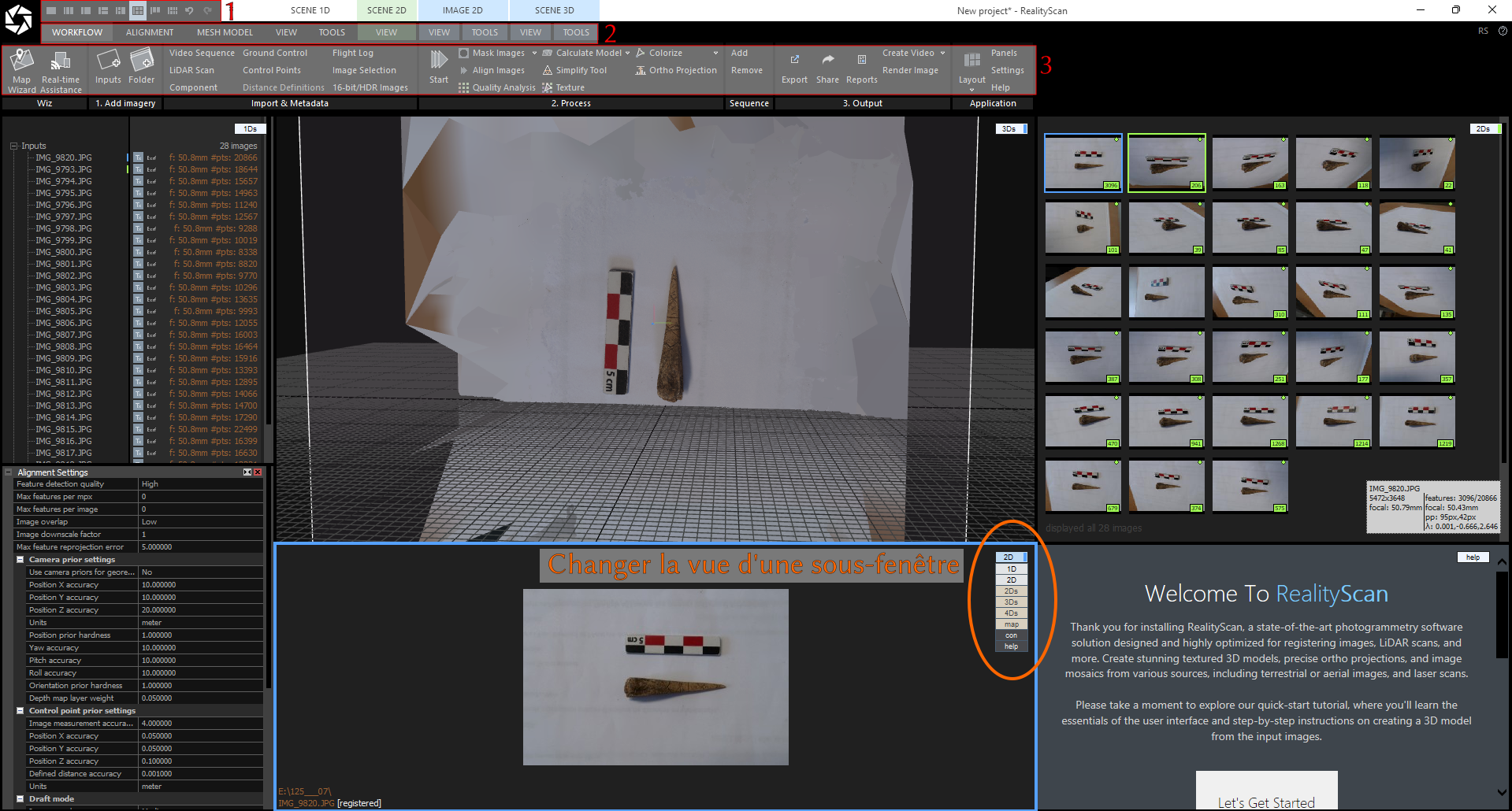 L'interface de RealityScan est souvent un peu déroutante la première fois si vous n'avez jamais fait de modélisation 3D (elle ressemble un peu à Blender (ou 3DS Max pour les gens qui aiment payer)). Une première chose à retenir, c'est qu'elle est complètement adaptable, on peut avoir de une à n sections dans la fenêtre principale. Un bouton très important pour ça, c'est ce que j'ai indiqué en 1 et qui vous permet de choisir le nombre de sous-fenêtres (appelées "views" dans le logiciel). Moi, j'aime bien la version utilisée dans la capture d'écran (logique, c'est mon ordinateur), comme ça j'ai un peu tout à la fois, les inputs et leurs paramètres, les photos que je peux observer individuellement, les photos en lot, la vue 3D et l'aide dans le coin (ça, c'est vraiment très pratique).